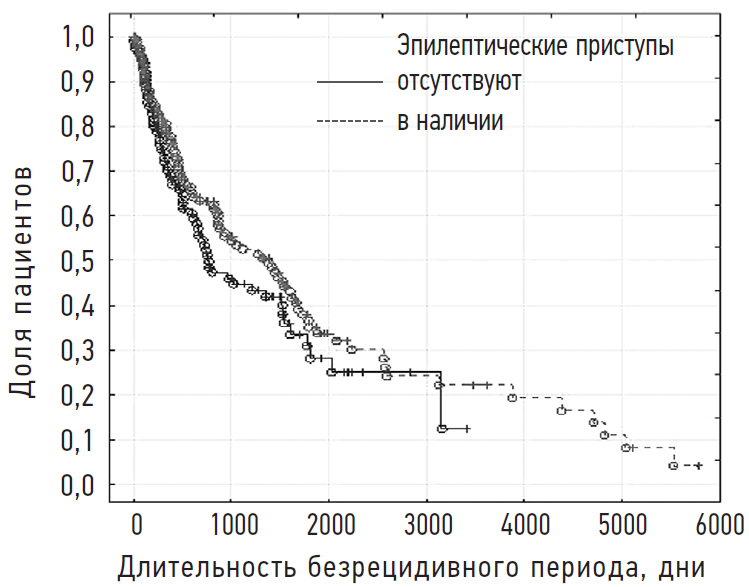 Рис. 6. Длительность безрецидивного периода у пациентов с диффузными глиомами головного мозга в зависимости от факта эпилепсии или однократного неспровоцированного эпилептического приступа до оперативного лечения (p < 0,01 по всему комплексу критериев)
