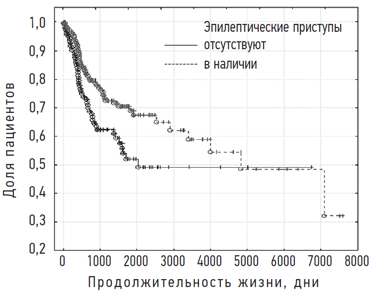 Рис. 7. Продолжительность жизни у пациентов с диффузными глиомами головного мозга в зависимости от факта эпилепсии или однократного неспровоцированного эпилептического приступа до оперативного лечения (p < 0,02 по всему комплексу критериев)