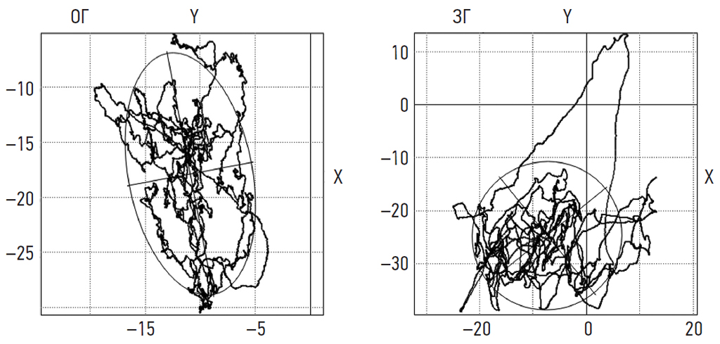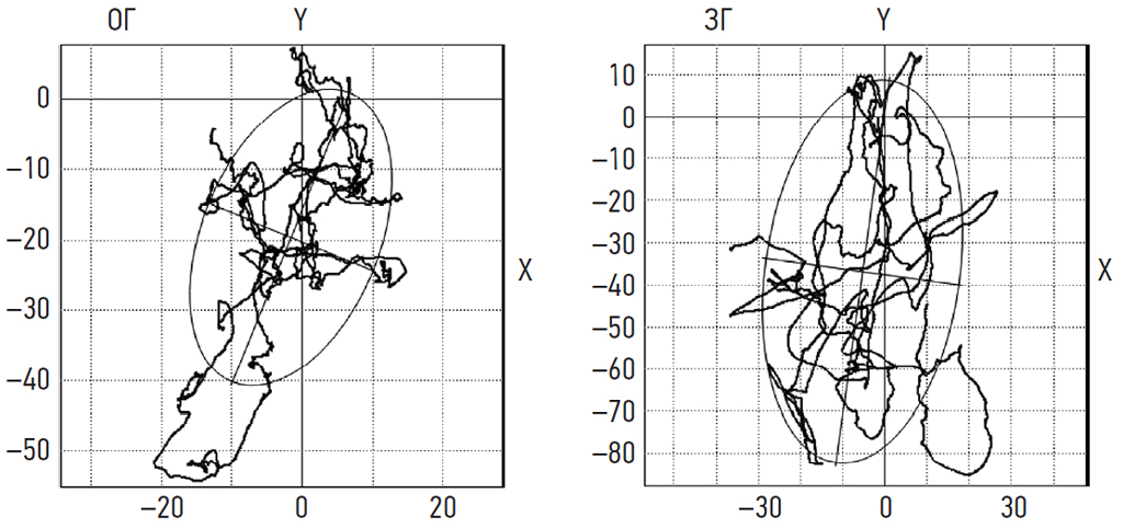 Fig. 1. SKG of a patient with mild traumatic brain injury and acubarotrauma with open (area 881.33 mm2, COP speed 15.07 mm/s) and closed (area 3328.56 mm2, COP speed 25.4 mm/s) eyes