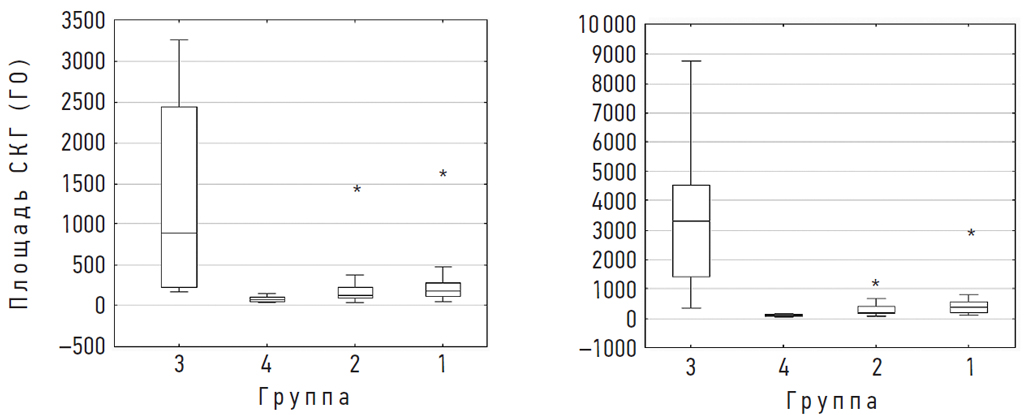 Рис. 3. Достоверно значимые различия площади СКГ между всеми исследуемыми группами и группой контроля (p < 0,05) с ГО и ГЗ