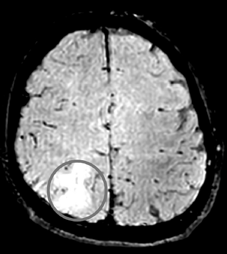Рис. 4. МРТ головного мозга в режиме SWI/SWAN пациента с ушибом головного мозга легкой степени. Кругом отмечен контузионный очаг 2-го типа в теменной доле справа. Диффузных микрокровоизлияний не обнаружено