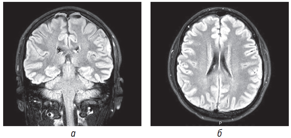 Рис. 1. Пациент Л. МРТ головного мозга — на корональном (а) и аксиальном срезах (б) (режим FLAIR) картина участка контузионных изменений в субкортикально-кортикальных отделах левой теменной доли размерами до 14 × 6 × 9 мм. До проведения МРТ пациент в течение 6 дней проходил лечение с диагнозом ЗЧМТ, СГМ. По данным КТ головы на 3-й день после травмы структурных нарушений выявлено не было