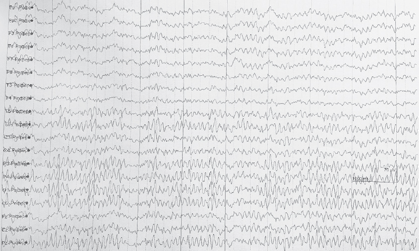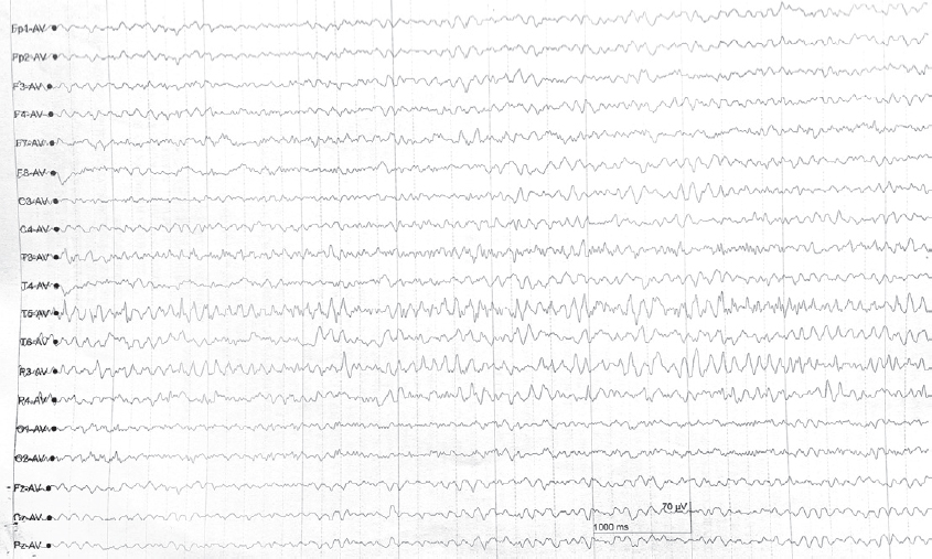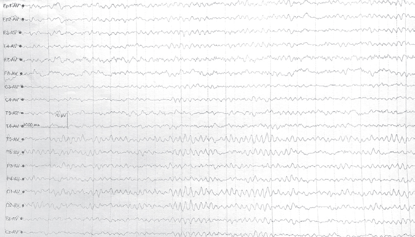 The second patient had an EEG 107 days after concussion, which revealed EA, with low-frequency sharp and slow alpha wave complexes (101 µV, 3 vibrations per second), predominantly in the temporo-parieto-occipital area (more on the left), with occasional synchronization (Figure 4). The brain MRI revealed no focal lesions.