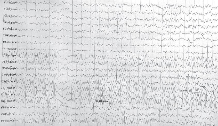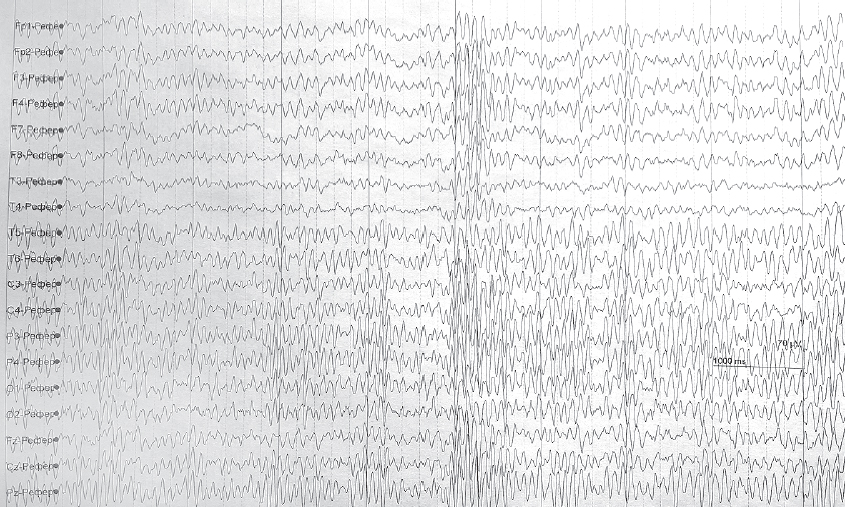 Рис. 4. Пациент В. ЭЭГ — на стыках веретен альфа-ритма низкочастотный бета-ритм, амплитудой 13 мкВ, комплексы «острая-медленная» волна амплитудой 101 мкВ, частотой 3 колеб./с, преобладающие в височно-теменно-затылочной области (слева больше, чем справа), периодически имеющие наклонность к синхронизации