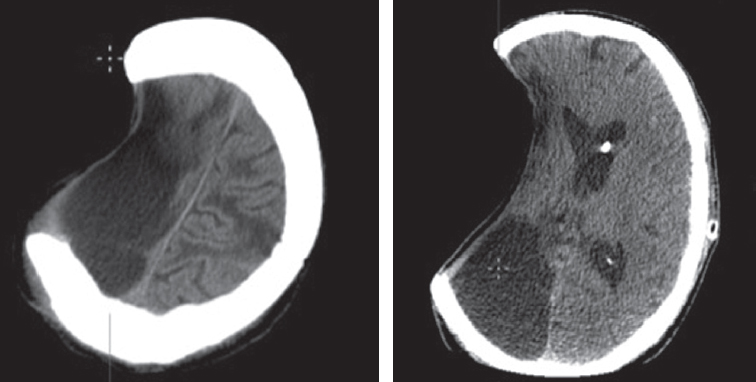 Fig. 5. Patient S. CT — trepanation defect in the frontal-temporal-parietal region on the right, measuring 9.2 × 13.7 cm (defect area 153 cm2). A zone of cystic-atrophic changes in the right hemisphere is determined. The median structures are shifted to the left by up to 0.4 cm. The lateral ventricles are dilated and symmetrical. In the area of the body of the left lateral ventricle, there is a proximal edge of the ventricular shunt (history of mine-blast injury)
