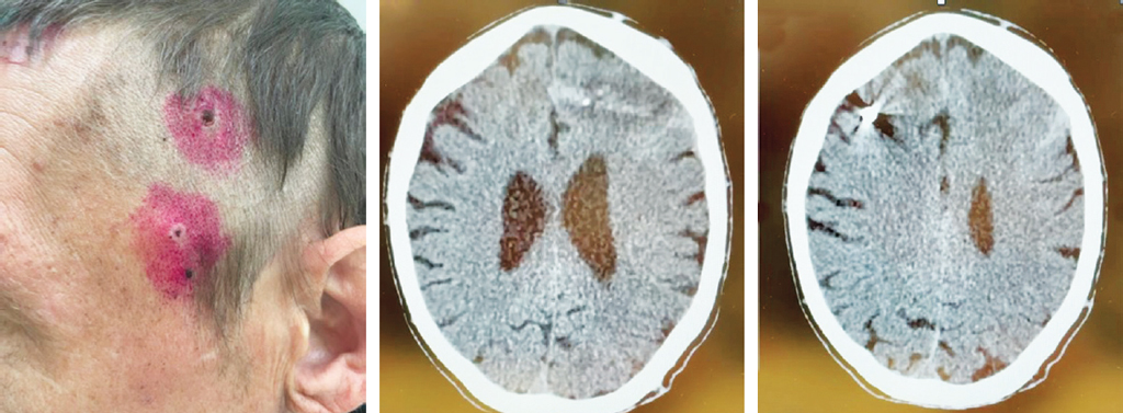 Fig. 6. Patient G. No active complaints consistent with brain injury, conscious, no neurological symptoms. Upon examination, the entrance holes of a penetrating blind craniocerebral wound are visualized in the left temporal region (at the time of injury, consciousness was not lost). CT of the head — a hypodense wound channel with the presence of foreign bodies of bone density was detected in the left frontal region, the wound channel goes upwards into the right frontal region of the brain with the presence of a foreign body of metallic density