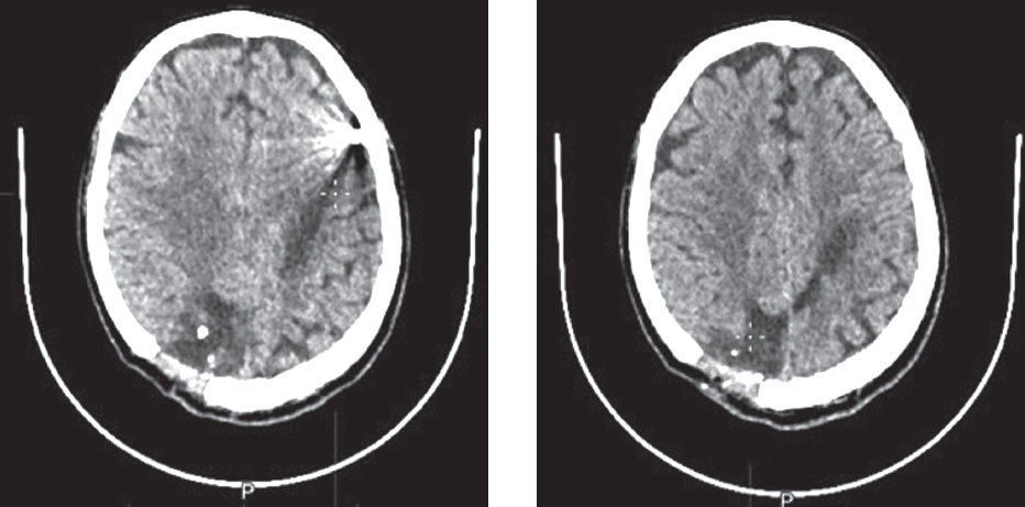 Fig. 7. Patient D. Head CT — condition after resection-decompression trepanation of the parietal bone on the right; a massive area of cystic-atrophic changes is noted in the right occipital, both parietal lobes and the frontal lobe on the left with approximate dimensions of 105 × 20 mm; in the cortical sections of the left frontal lobe, a foreign body of metallic density with dimensions of 9 × 8 mm is noted