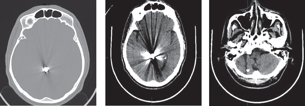 Рис. 6. Пациент Г. Без активных жалоб, соответствующих травме мозга, в ясном сознании, без неврологической симптоматики. При осмотре в левой височной области визуализируются входные отверстия проникающего слепого черепно-мозгового ранения (в момент получения травмы сознание не терял). КТ головы — в левой лобной области выявлен гиподенсный раневой канал с наличием инородных тел костной плотности, раневой канал идет вверх в правую лобную область мозга с наличием инородного тела металлической плотности