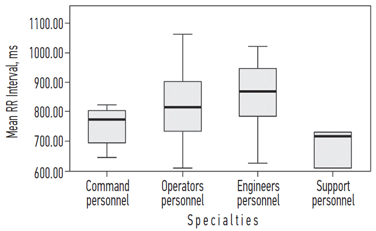 Рис. 3. Распределение средней длительности RR-интервалов в группах специалистов различного профиля.