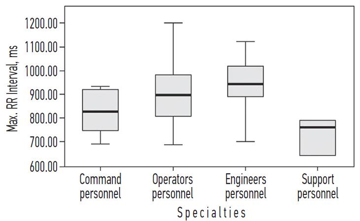 Рис. 4. Распределение максимальной длительности RR-интервалов в группах специалистов различного профиля.