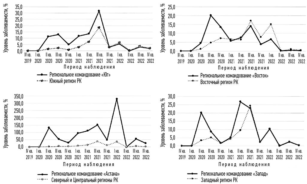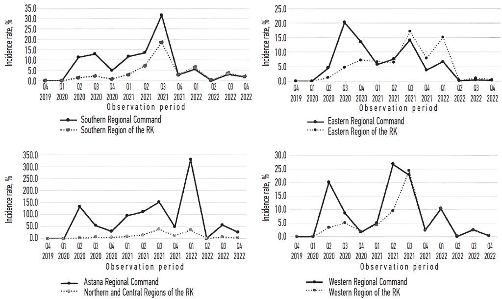 Рис. 1. Квартальная динамика заболеваемости COVID-19 военнослужащих региональных командований и гражданского населения соответствующих административно-территориальных регионов Республики Казахстан (РК) в 2020–2022 гг. (‰).