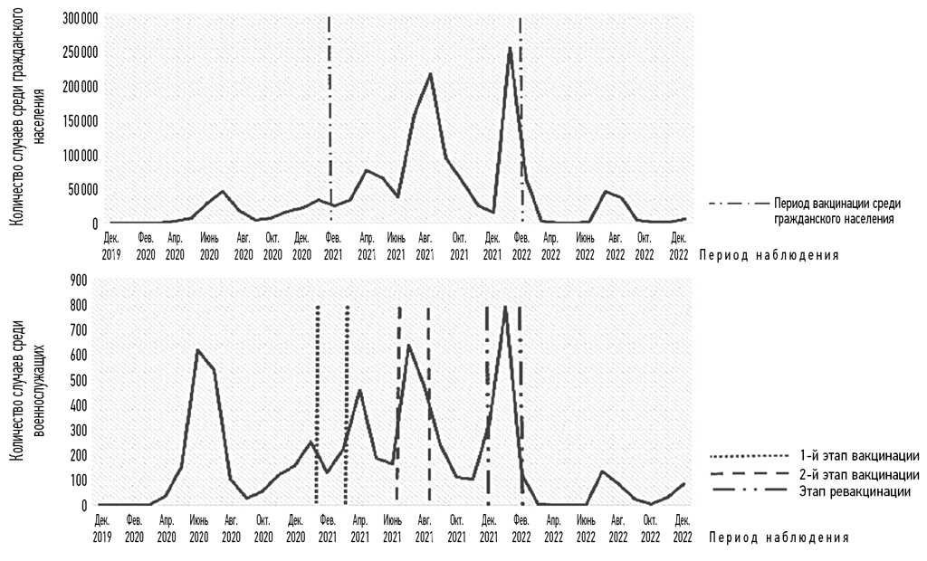 Первоначальный этап характеризовался внедрением результативного комплекса противоэпидемических мероприятий в воинских подразделениях, что обеспечило стабилизацию эпидемиологической обстановки в период до начала вакцинации в апреле — августе 2021 г. (рис. 1).