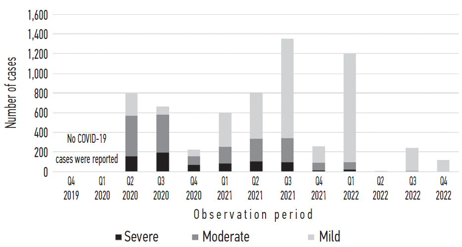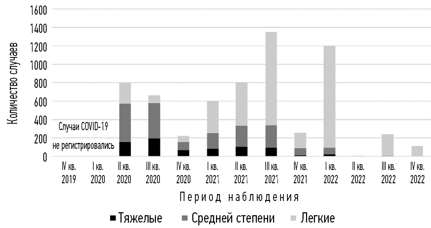 Fig. 3. Changes in the distribution of clinical severity of COVID-19 among service members of the Armed Forces of the Republic of Kazakhstan during different stages of the pandemic (absolute numbers).