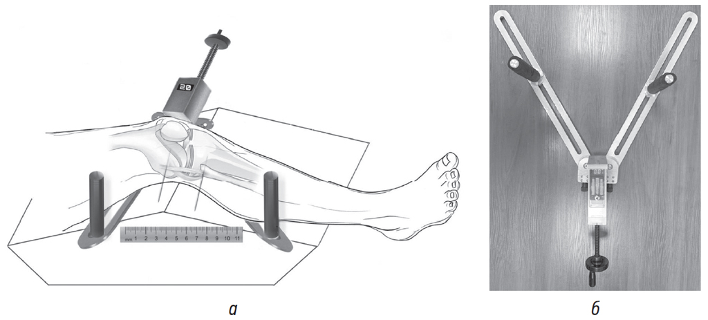 В первой серии путем последовательного пересечения задней крестообразной связки, МбКС, СПкМ и ПкМС моделировали варусную нестабильность коленного сустава, используя для ее подтверждения оригинальное устройство (патент РФ на полезную модель № 197909 от 10.01.2020 г.) (рис. 1, а, б).