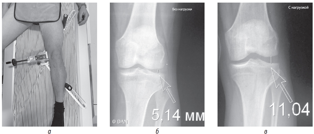 Рис. 2. Функциональная рентгенография коленного сустава с аппаратно задаваемой варусной нагрузкой: а) внешний вид ко-нечности с устройством для функциональной рентгенографии; б) рентгенограмма коленного сустава в прямой проекции без нагрузки; в) рентгенограмма коленного сустава в прямой проекции с нагрузкой при повреждении ЗЛУ