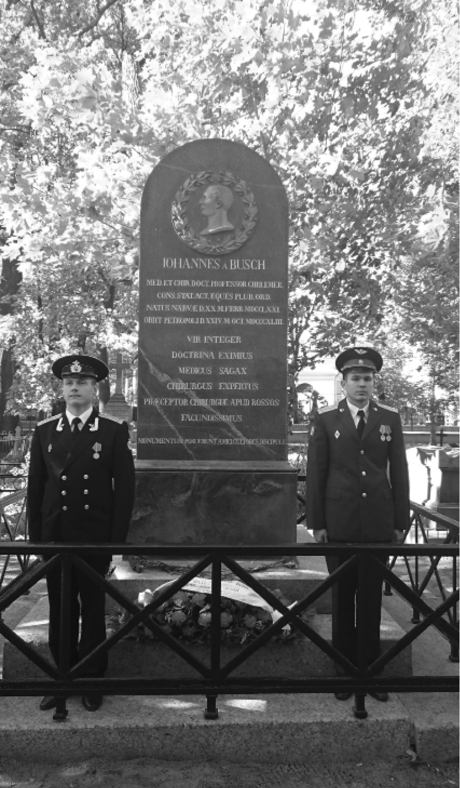 Рис. 4. Возложение цветов на могиле И. Ф. Буша в день 215-летия образования кафедры общей хирургии (сентябрь 2015 г.)