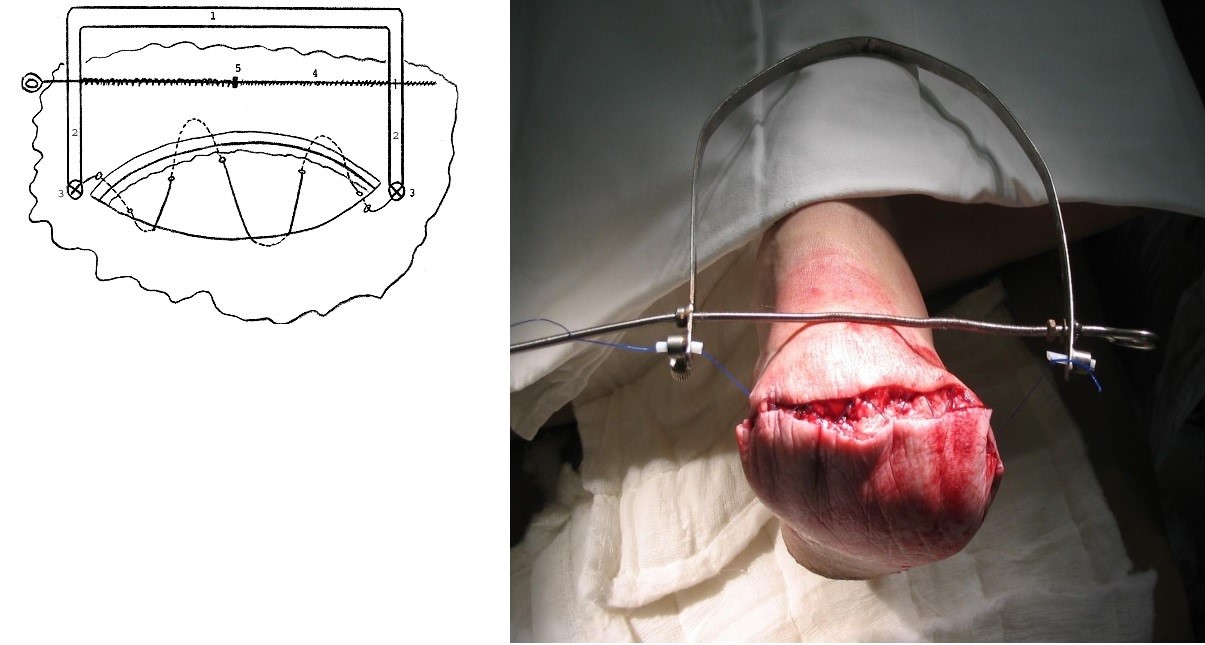 Невозможность соединения краев ран больших размеров привело к разработке и применению устройства (рис. 1). Нить с помощью хирургической иглы проводится через мягкие ткани с обеих сторон раны. По углам раны, в местах выхода концов нити, подводится каркасное устройство, к которому крепятся концы нити. При натяжении нити за счет удлинения каркаса с помощью винта происходит дозированное сближение краев раны. Постепенное натяжение мягких тканей в зоне раны, особенно кожи, предотвращает часто возникающие краевые некрозы в местах наложения узловых швов. Дозированное, управляемое закрытие раны создает благоприятные условия для ее полного закрытия, а также дает возможность проводить местные лечебные мероприятия, направленные на очищение раны от некротических тканей, профилактику и подавление инфекции.