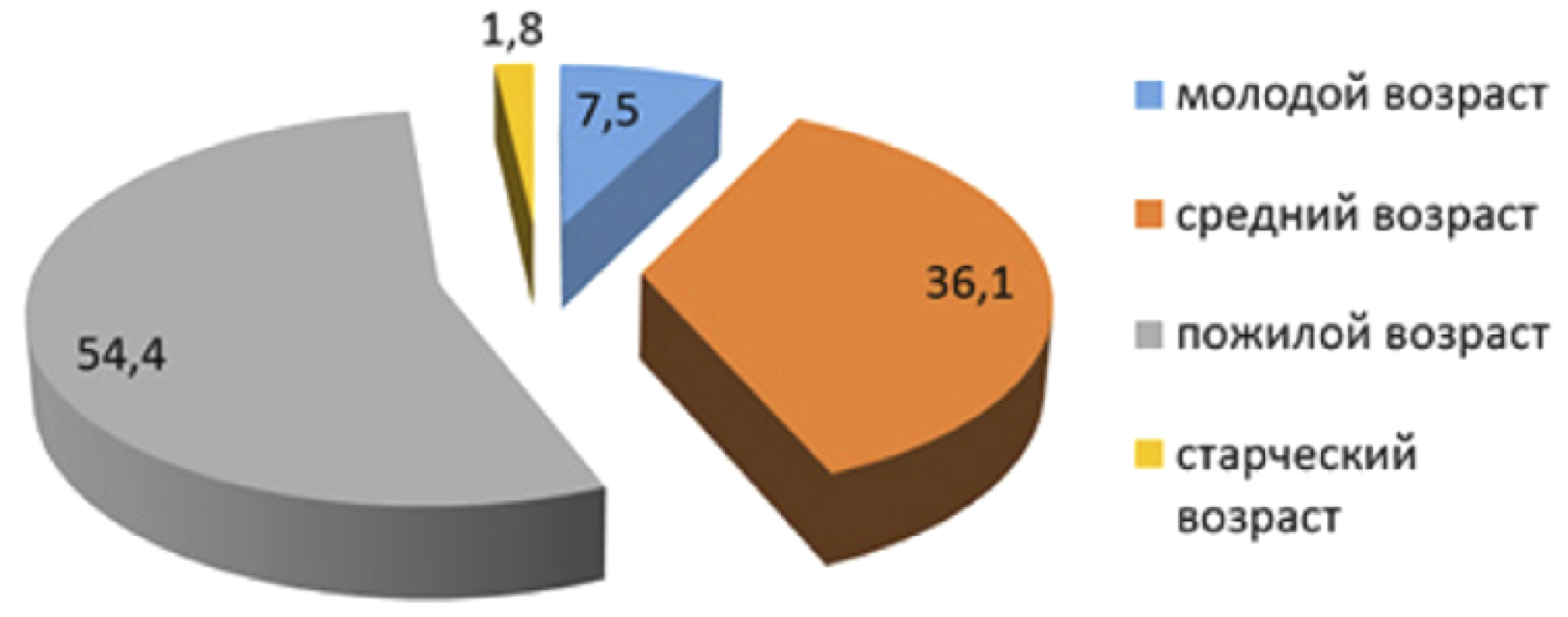 Общее количество пролеченных больных составило 216 человек, из них 43 мужчины и 173 женщины. Распределение пациентов по возрасту (по классификации ВОЗ) представлено на рис. 1.