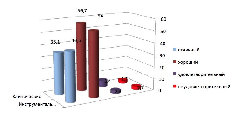 Оказалось, что ближайшие отличные и хорошие результаты лечения по клиническим данным имели место в 92% случаев, на долю удовлетворительных и неудовлетворительных результатов пришлось соответственно 5,4 и 2,7% случаев. По результатам инструментального обследования показатели отличных и хороших результатов составили соответственно 40,6 и 54%; удовлетворительных и неудовлетворительных — 2,7 и 2,7% (рис. 2).
