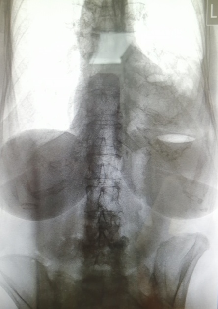 Инструментальные методы исследования. Ультразвуковое исследование органов брюшной полости от 02.01.2020 г.: УЗ-признаки диффузных изменений печени по типу фиброза; полипы желчного пузыря; диффузные изменения поджелудочной железы; МКБ, камни и микролиты обеих почек; гастростаз. Видеогастродуоденоскопия от 05.01.2020 г.: кардия расположена на 34 см от резцов, определяется выраженная деформация просвета за счет смещенного желудка на 3/4 выше хиатального отверстия. В просвете большое количество застойного содержимого (более 1,0 л) и его отсутствие в антральном отделе. Выполнено заведение двухпросветного питательного зонда диаметром 12Fr до уровня связки Трейца. Тотальная параэзофагеальная грыжа. Эритематозная гастропатия. Деформация луковицы двенадцатиперстной кишки. Фунуция внешнего дыхания (ФВД) от 10.01.2020: ФВД сохранена. Жизненная емкость легких — нижняя граница нормы. Рентгенография желудка: нижняя 1/3 пищевода образует изгиб в грудной полости. Весь желудок, газовый пузырь расположен в грудной полости. Желудок заполнен контрастом по малой кривизне на задне-боковой стенке втяжения. Эвакуации контраста из желудка нет.