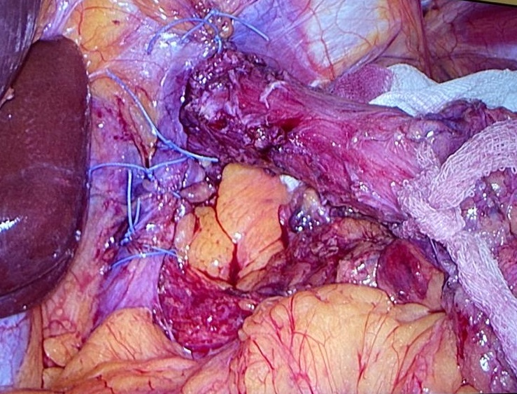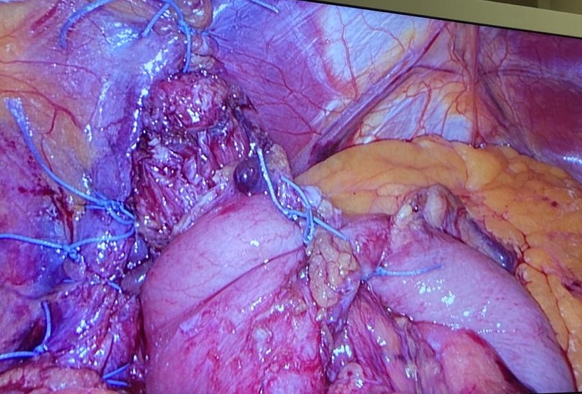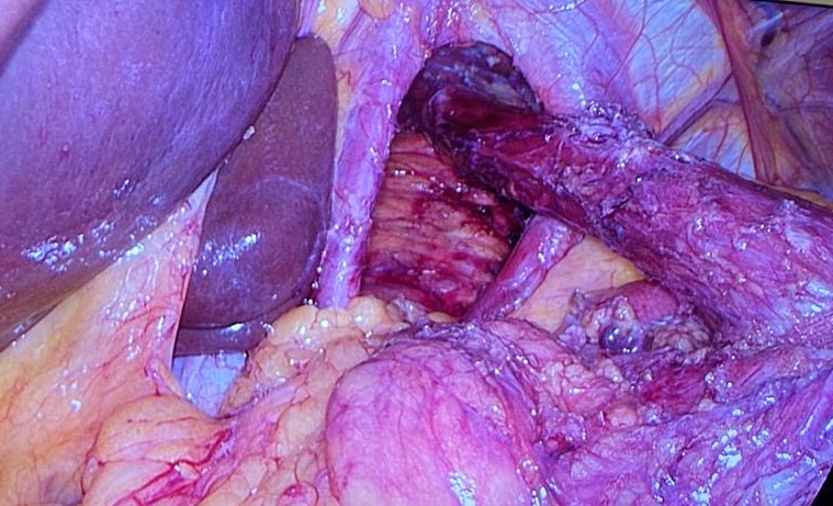 После компенсации водно-электролитных нарушений, стабилизации пациентки была выполнена плановая операция 11.01.20 г.: пластика диафрагмальной грыжи, задняя и передняя диафрагмокрурорафия, фундопликация по Ниссену. При ревизии обнаружено, что желудок полностью смещен в средостение через пищеводное отверстие диафрагмы и фиксирован там рубцово-спаечным процессом. В грыжевом мешке также располагаются поперечно-ободочная кишка и петля тонкой кишки. Ультразвуковыми ножницами рассечены спайки и рубцы. Поперечно-ободочная кишка, желудок низведены в брюшную полость. С помощью ультразвукового диссектора пересечены короткие желудочные сосуды, мобилизован свод пищевода, выделена его нижняя треть. Пищеводное отверстие дифрагмы расширено до 10 см (рис. 7).