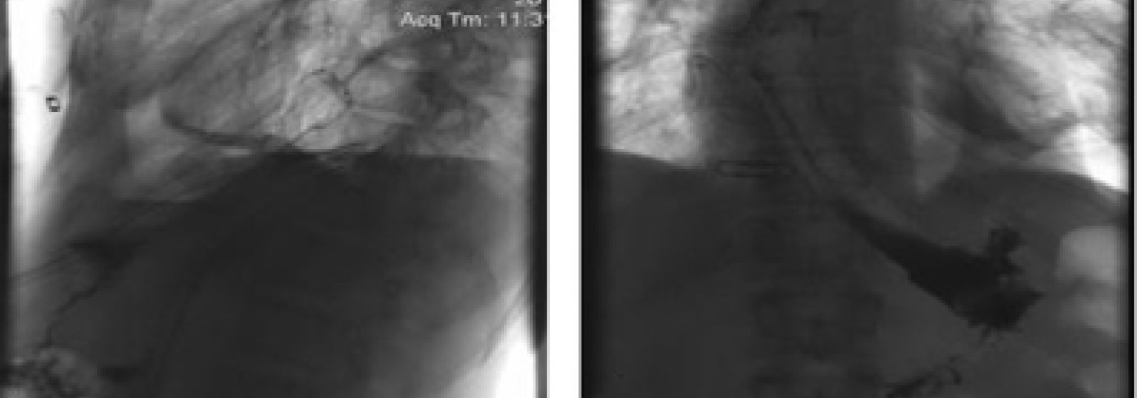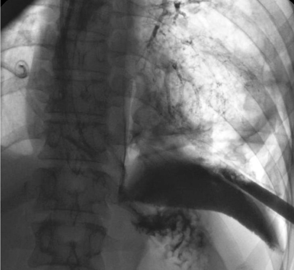 Рис. 1. Рентгенконтрастное исследование пищевода. Затек контрастного вещества в левую плевральную полость