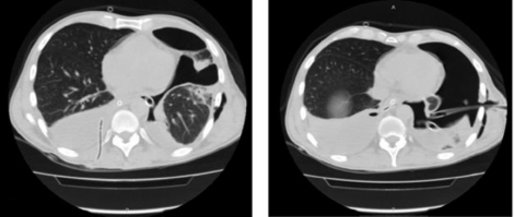 Рис. 2. Компьютерные томограммы (А и Б) в аксиальной проекции. Двусторонний гидроторакс, слева гидропневмоторакс на фоне энтерального зонда и дренированных плевральных полостей
