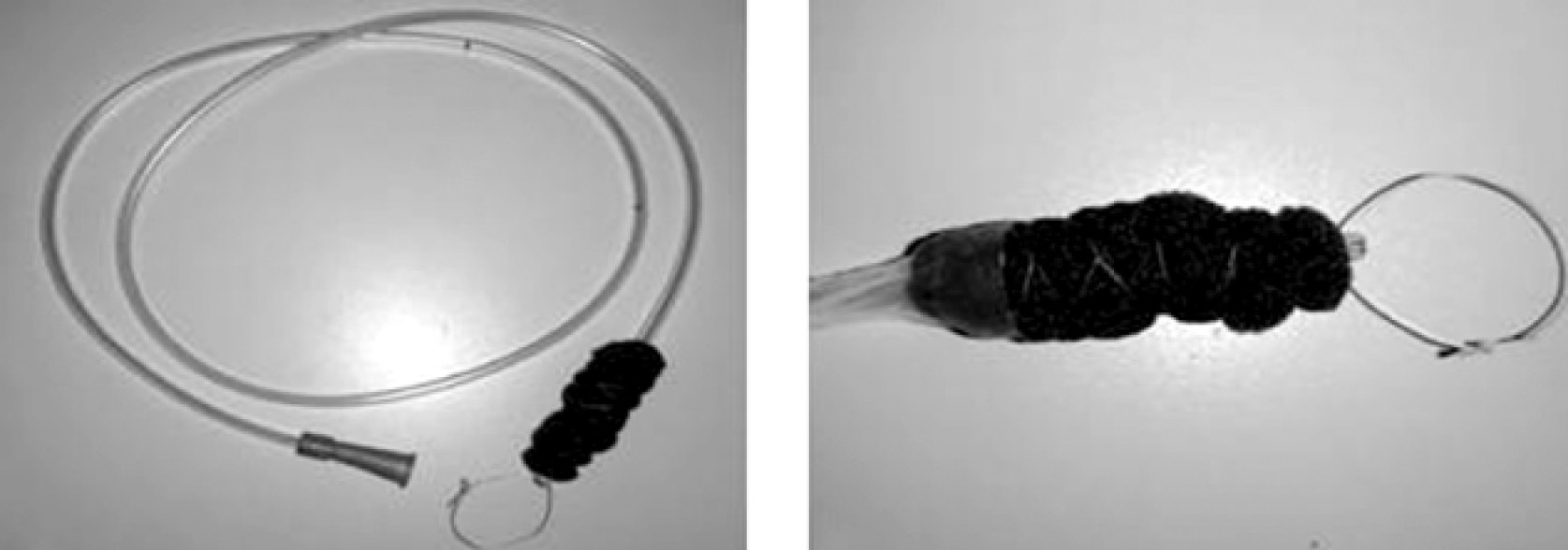 На 12-е сут от начала заболевания выявлены эпизоды миграции стента как в проксимальном, так и в дистальном направлении. Попытки стабилизировать стент оказались безуспешными. Пищеводный стент удален. При контрольной фиброэзофагоскопии дефекта слизистой по правой стенке пищевода нет, по левой стенке сохранялся свищевой ход размером до 18 мм в диаметре. Через свищевой ход был виден дистальный конец плеврального дренажа. Снаружи через проксимальный конец дренажной трубки введен мягкий проводник, который под контролем и при помощи эндоскопа сначала проведен в просвет пищевода, а потом выведен наружу через рот, по которому в свищевой ход установлена система для терапии отрицательным давлением (VAC-терапии) (рис. 4).