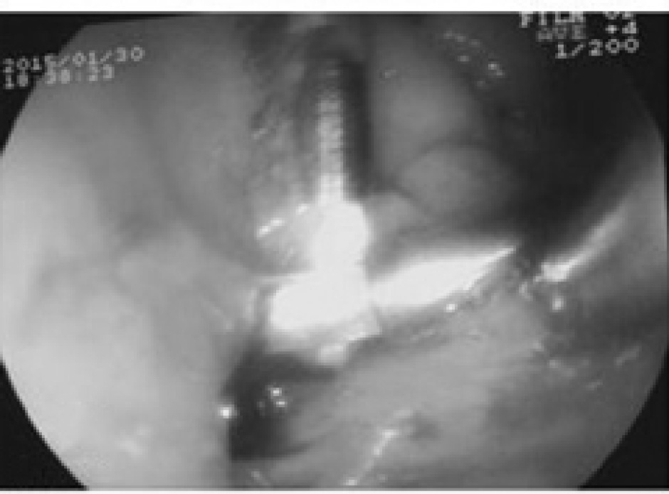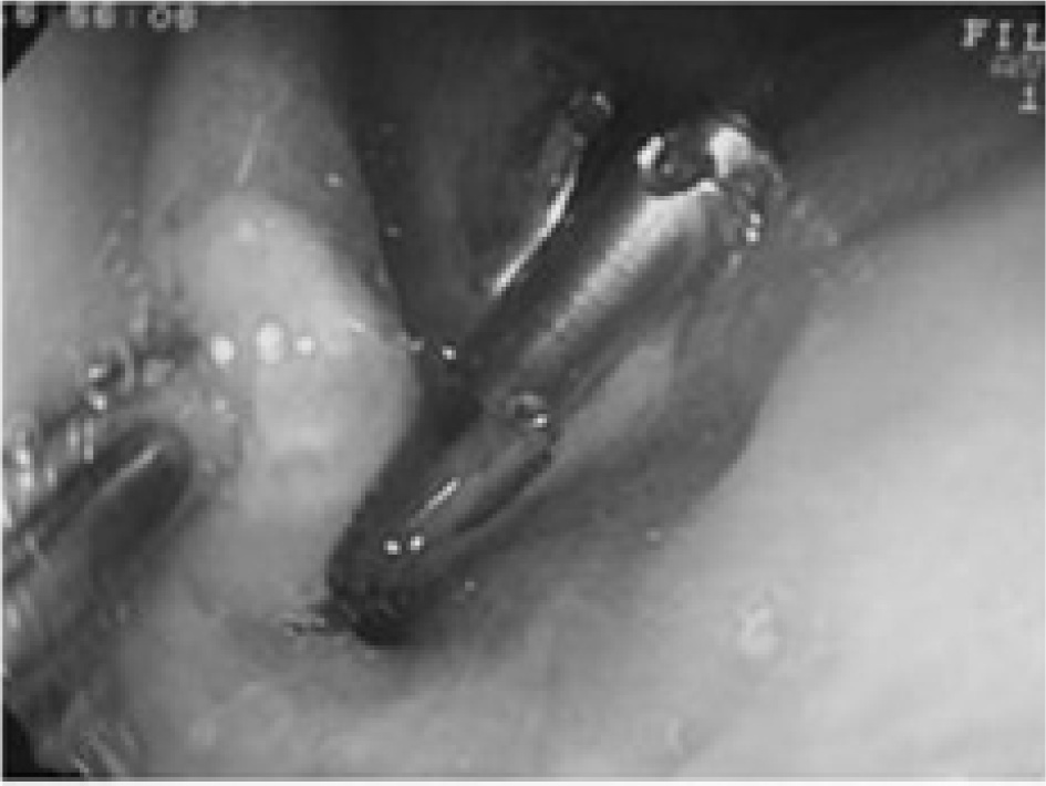 С целью уменьшения диаметра дефекта слизистой и формы свищевого хода на края слизистой в области дефекта наложены эндоклипсы (рис. 6).