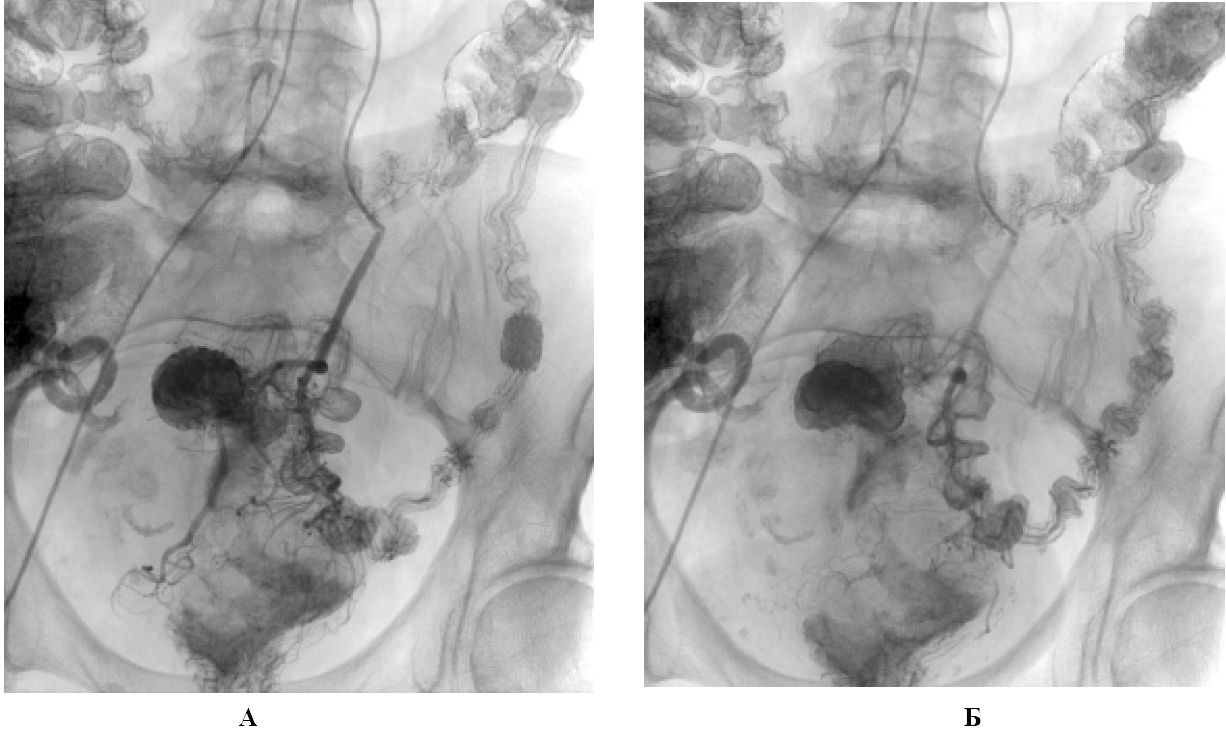 Рис. 1. Ангиограмма нижней брыжеечной и верхней прямокишечной артерий больной З., 68 лет: А — до эмболизации; Б — после эмболизации верхней прямокишечной артерии