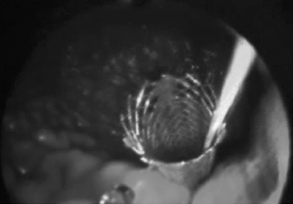 В 7 случаях пациентам с постнекротическими кистами, содержащими секвестры, выполнено эндоскопическое цистогастральное стентирование с использованием металлического покрытого саморасширяющегося стента диаметром 10 мм (рис. 2, 3), с временной установкой санационного цистоназального катетера через просвет стента.