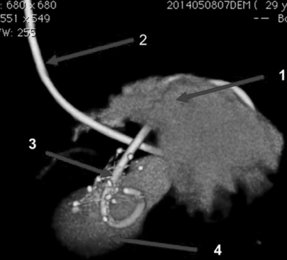 Рис. 3. КТ-3D реконструкция. 1 — просвет желудка; 2 — цистоназальный дренаж; 3 — саморасширяющийся стент; 4 — полость кисты поджелудочной железы