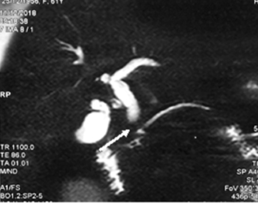 В 2018 г. впервые обратилась в клинику общей хирургии по поводу наличия болевого синдрома в правом подреберье. На момент обследования у пациентки по данным ультрасонографии и магнитно-резонансной томографии в холангиорежиме выявлены признаки билиарной гипертензии за счет стриктуры интрапанкреатической части холедоха, признаки холецистолитиаза (рис. 1).