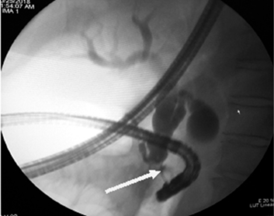 Учитывая представленные данные, сформулированы показания к выполнению эндоскопической ретроградной холангиопанкреатикографии, по данным которой гепатикохоледох расширен до 12 мм, в интрапанкреатической части определяется стриктура с сужением просвета до 2 мм и протяженностью 10 мм. При контрастировании панкреатического протока определяется кистозное образование в проксимальной части панкреатического протока головки ПЖ с последующим заполнением его дистальных отделов (рис. 2).