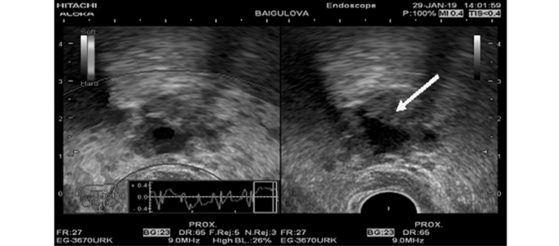 Рис. 4. Эндосонограмма. Признаки папиллярной ткани в области кистозного образования ГПП
