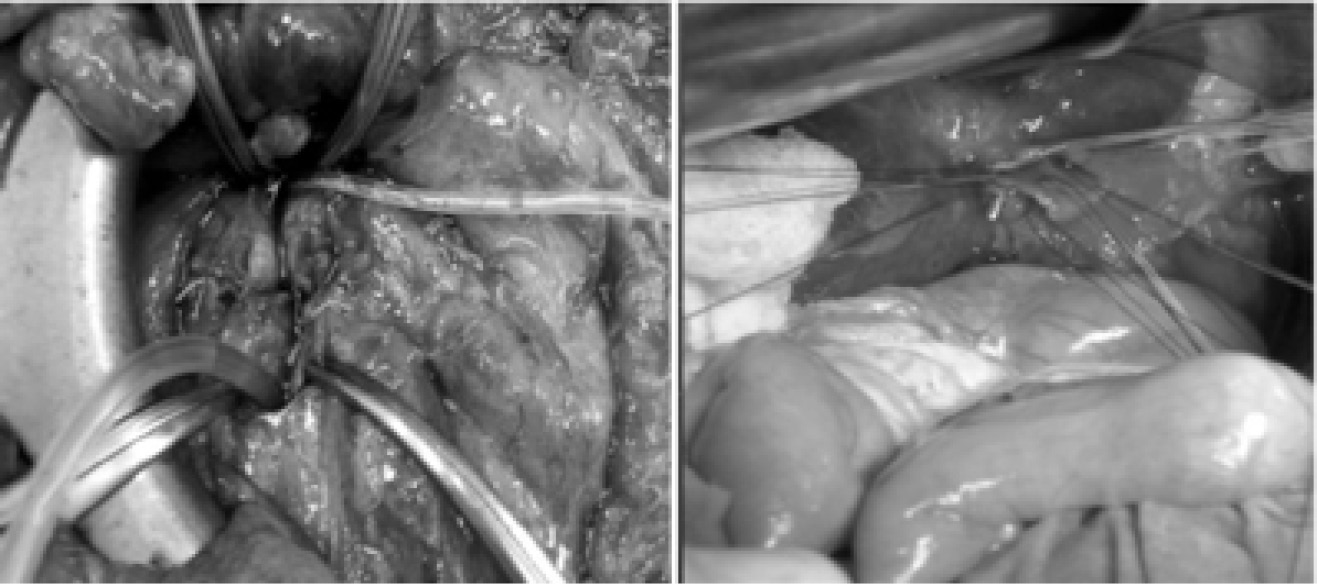 Рис. 5. Этапы наложения панкреато- и холедохоэнтероанастомозов. А) Панкреатоэнтероанастомоз. Б) Холедохоэнтероанастомоз