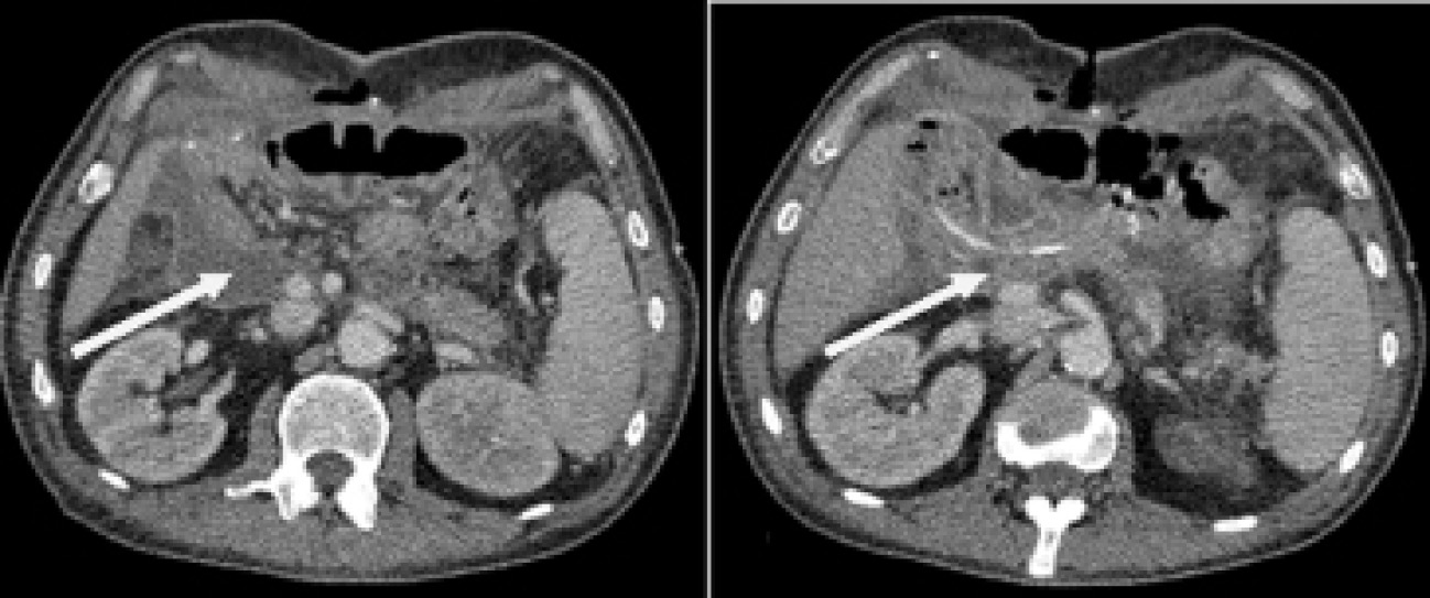 Рис. 7. Компьютерная томограмма. А) Свободная жидкость в области ПЕА; Б) Дренирование зоны ПЕА