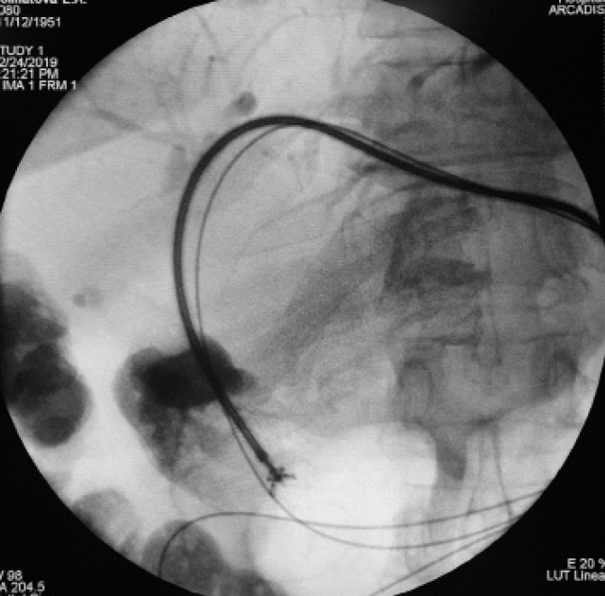 В октябре 2019 г. у пациентки появилась жалобы на желтушность кожного покрова и слизистых, общую слабость, умеренную, ноющую боль в эпигастральной и правой подреберной областях, повышение температуры тела до фебрильных цифр. Больная была госпитализирована с диагнозом «механическая желтуха, холангит». Попытки эндоскопического редренирования желчных протоков оказались безуспешны. При выполнении чрескожной чреспеченочной холангиографии в месте слияния культи правого долевого и левого долевого протоков с переходом на гепатикохоледох определялась злокачественная стриктура (Bismuth II). Контрастный препарат в гепатикохоледох, двенадцатиперстную кишку не поступал. Выполнено чрескожное чреспеченочное наружновнутреннее дренирование желчных протоков единственной левой доли печени. Установлен желчный дренаж диаметром 8,5 F (рис. 1).
