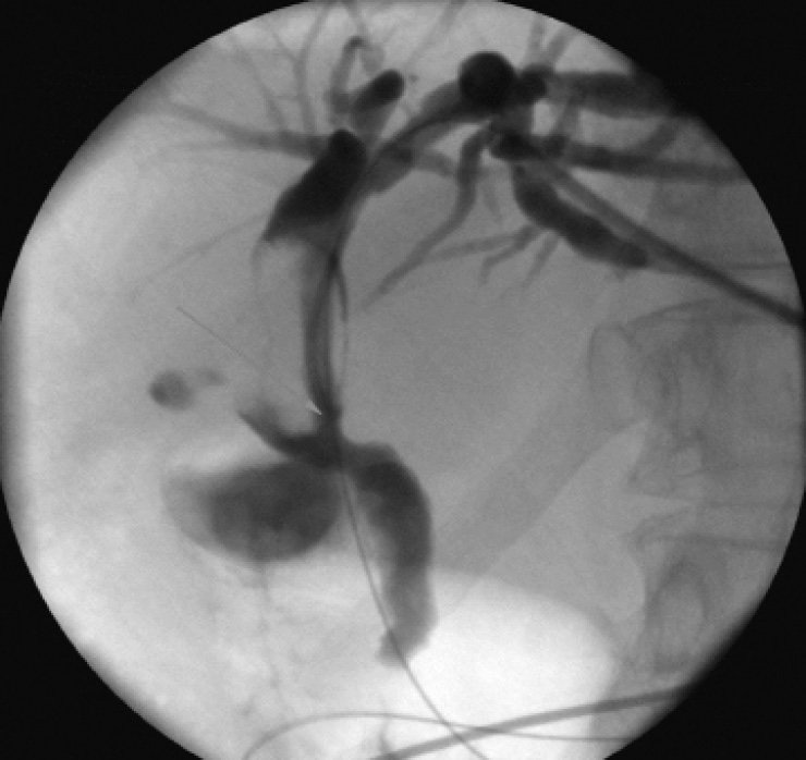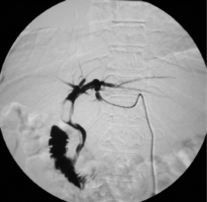 Рис. 1. Чрескожное чреспеченочное наружновнутреннее дренирование желчных протоков единственной левой доли печени