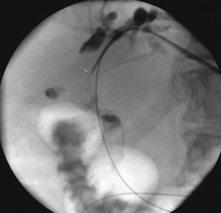 Рис. 3. Чрескожная чреспеченочная эндобилиарная фотодинамическая терапия холангиокарциномы. Стрелкой указан кончик микрокатетера (начало процедуры)