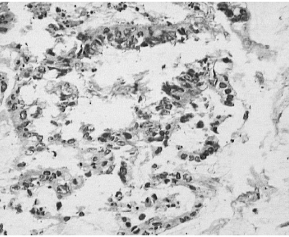 Рис. 5. Микрофото. Ув.×250. Окраска гематоксилин и эозин. Некроз холангиокарциномы после ФДТ — III степень лечебного патоморфоза по классификации O. Dworak и соавт. [5]