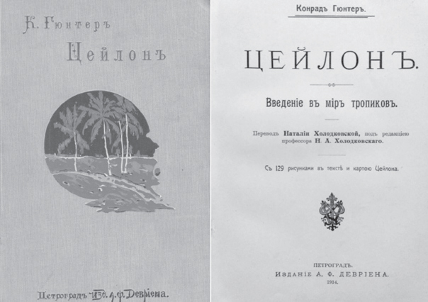 Страсть к путешествиям была присуща всем Холодковским. Дядя Натальи по отцу — алтайский горный инженер Александр Александрович — в 1900 г. посетил Индию, Цейлон, Японию, Порт-Артур. Видимо, его рассказы об этом путешествии, описания экзотических природных красот Востока весьма впечатлили Николая Александровича и его дочь. Он планировал побывать в дальних странах, но не случилось… Тем не менее в 1913 г. 22-летняя Наталья перевела с немецкого книгу Конрада Гюнтера «Цейлон», имевшую подзаголовок «Введение в мир тропической природы», которая вышла под редакцией и с предисловием ее отца [9] (рис. 7).
