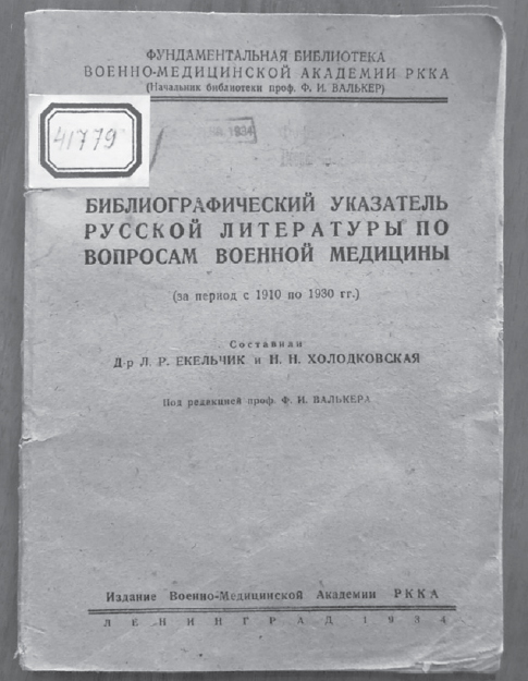 - Ekel’chik LR, Kholodkovskaya NN, comp. Bibliographic index of Russian literature on military medicine (for the period from 1910 to 1930). Val’ker F.I., ed. Issue 1. Leningrad; 1934. (In Russ.)