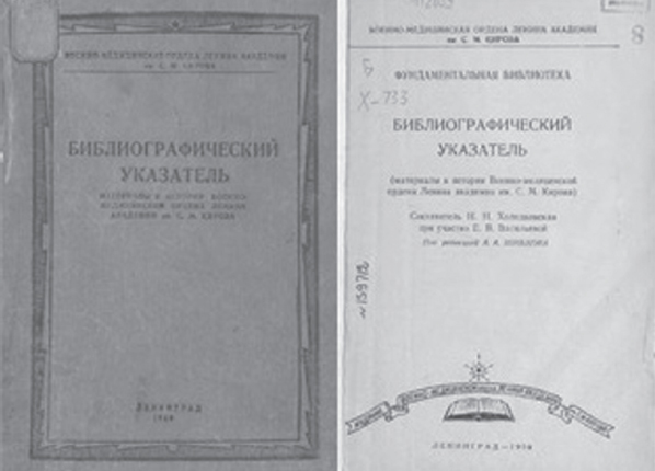 - Nevskiy VA. Book Review: Kholodkovskaya NN, Vasil’yeva EV, comp. Materials for the history of the Order of Lenin Military Medical Academy named after S.M. Kirov: bibliographic index. Leningrad; 1959. Sovetskoe zdravookhraneniye. 1961;7:92. (In Russ.)
