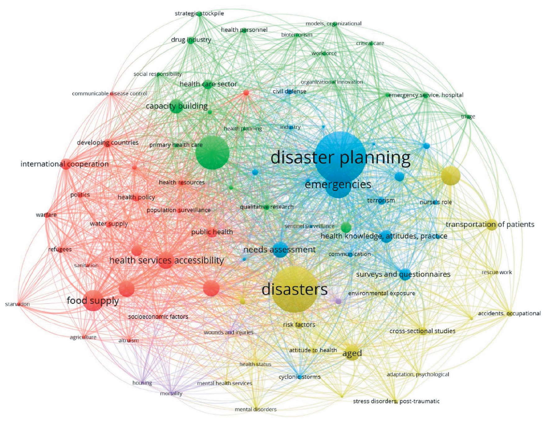 The most significant keywords (phrases) for the third cluster, which reflected accumulated experience in responding to technological emergencies, were знания, отношение и практика в области здравоохранения (health knowledge, attitudes, practice), планирование действий в случае стихийных бедствий (disaster planning), отношение медицинского персонала (attitude of health personnel), and оценка потребностей (needs assessment).