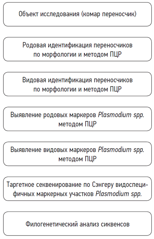 Дизайн исследования включал сбор и идентификацию переносчиков, а также исследование их инфицированности малярийными плазмодиями (рис. 1).