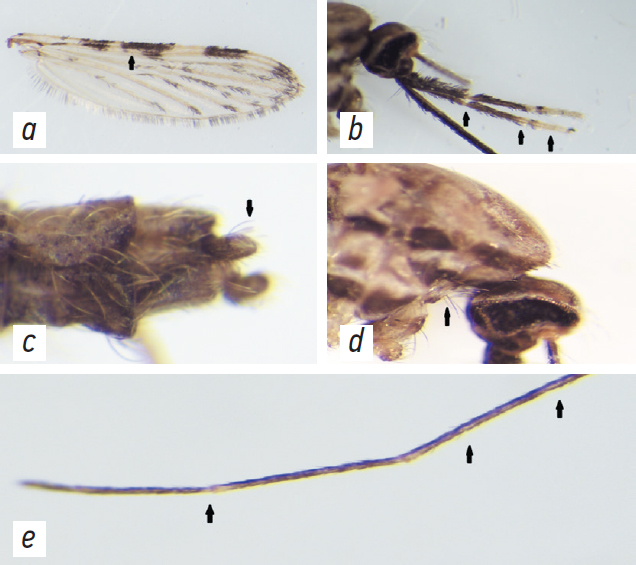 Рис. 3. Отличительные морфологические особенности An. epiroticus (группа Pyretophorus): a — крыло, ASP на жилке R1; b — максиллярный щупик; c — сегменты VI, VII и половые органы; d — проэпистернальные щетинки; e — тарсомеры и светлые чешуйки на голени.