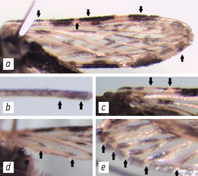 Рис. 4. Отличительные морфологические особенности комаров An. gigas (группа Gigas): a — крыло, жилки С и R-R1; b — заднее бедро; c — PSP и HP жилки C; d — край крыла; e — жилка А1.