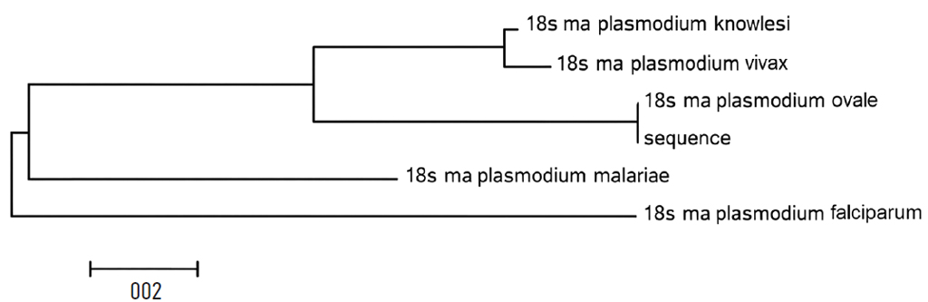 Рис. 5. Филогенетическое дерево, построенное на основе сравнения частичных последовательностей нуклеотидов гена 18s rRNA исследуемой последовательности, полученной из образца самки комара рода Anopheles, с частичными последовательностями 18s rRNA пяти видов плазмодиев — возбудителей малярии человека с помощью метода максимального правдоподобия.