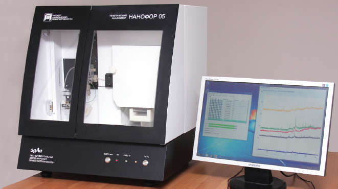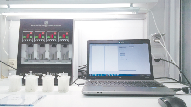 В Институте аналитического приборостроения ведутся работы по созданию автоматизированных систем пробоподготовки и анализа биологических образцов. В разработках применяется идеология использования одноразовых полимерных картриджей, обеспечивающих возможность герметичных манипуляций с биологической пробой. Разработан и производится по заказам комплект молекулярно-биологических тест-систем, реактивов и аналитических приборов для выявления, идентификации и генетического типирования возбудителей особо опасных инфекционных заболеваний. Составляющими этого комплекта являются: комплекс для выделения нуклеиновых кислот (КВНК) (рис. 1), прибор АНК-32 для полимеразной цепной реакции в реальном времени (ПЦР-РВ) [1] (рис. 2) и прибор НАНОФОР 05 [2] для генетического типирования возбудителей инфекционных заболеваний бактериальной и вирусной природы (рис. 3).